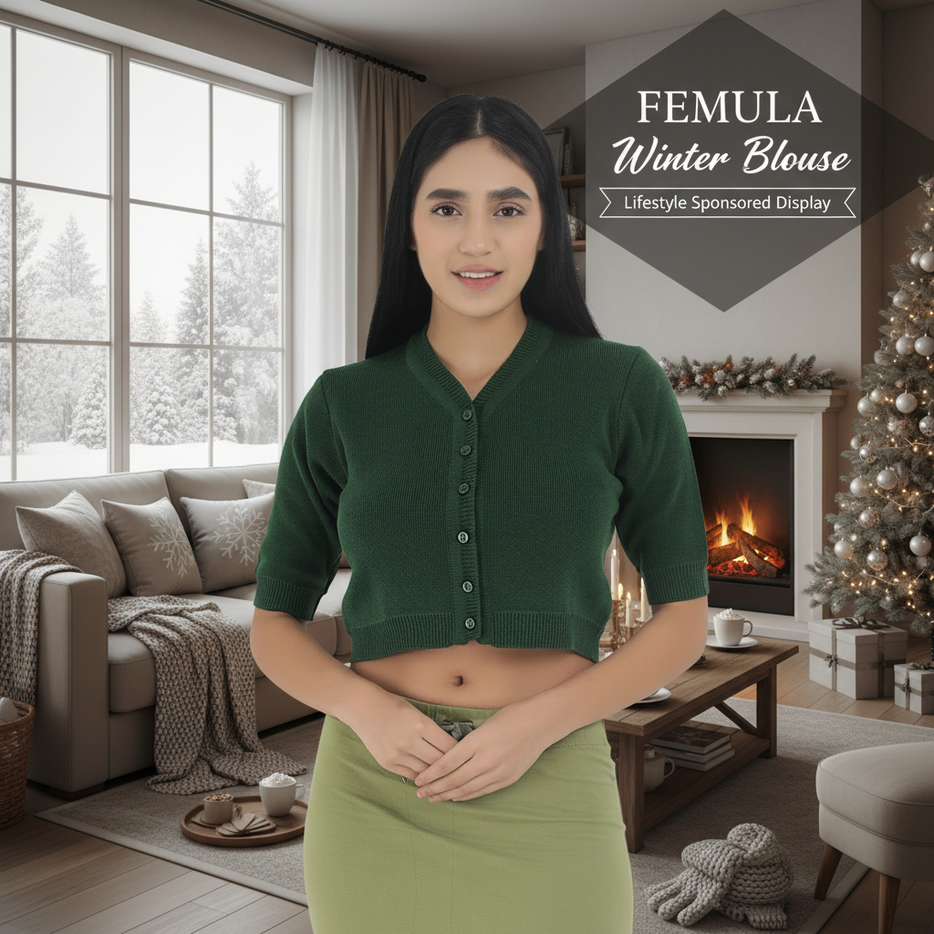 Made With Best Quality Cashmilon Wool, Knitted Blouse Made on Automatic Machines in Ludhiana, Punjab. Designer Lace Made of Same Knitted Material Runs Through Entire Open Front. Having 5 Pearl Finish Branded Buttons, Front Opening. Snug Fits Like a Half Sleeves Blouse to Women Wearing Saree & Also Used as Woolen Top By Girls.